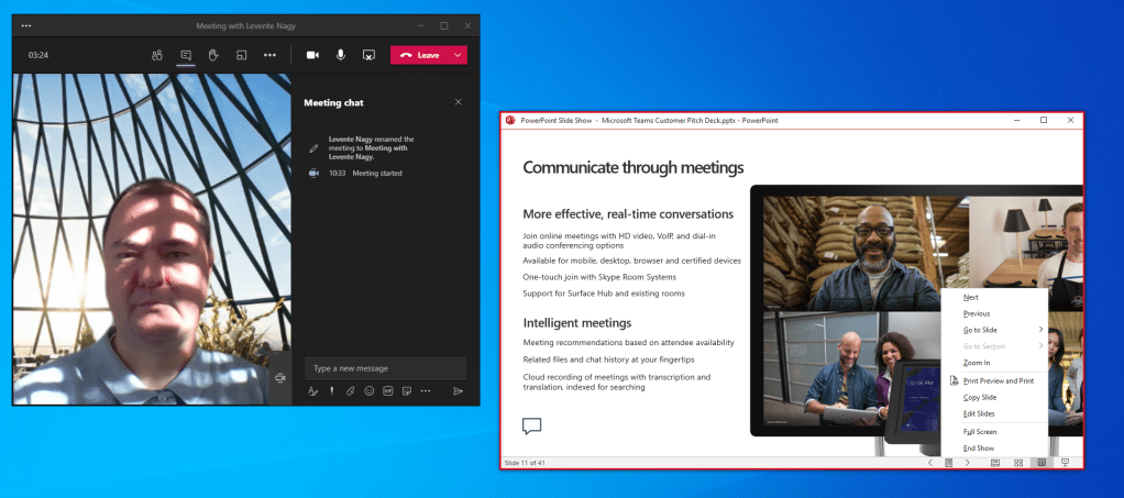 If you are short on screen real-estate and struggle to fit your multiple windows across your screen then you might want to check if your screen is set to higher than 100% scaling. Many modern displays trade off resolution with screen real estate to provide smooth fonts that are easy to read with large enough text that is legible but during a presentation you probably won’t need that and the extra pixels will help you position the video call window next to your presentation. You can always reset it after the presentation is over before you get back to your e-mails.
