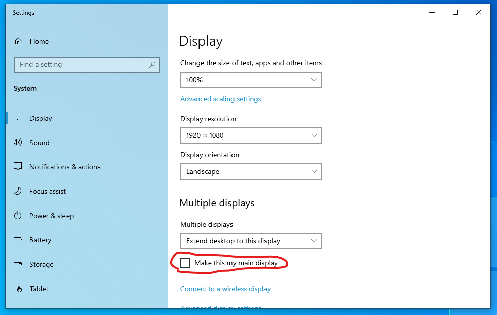 - Primary display: Windows starts most newly launched applications on the primary display (this is where the clock is also displayed on the taskbar). As you may launch applications during your presentation that you wouldn’t want to share (forgot to start OneNote for taking notes?) it is worth setting the hot screen to not be the primary one. This is a checkbox on the display settings window: