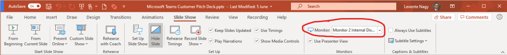 When using this setup, it is important to set up PowerPoint ahead of the time to use the right screen for your presentation so that the audience won’t be looking at your presenter view. Fortunately you will only need to do this once and PowerPoint will remember the setting if your setup does not change. On the SlideShow ribbon you can set which screen is to be used for the presentation and the presenter view: